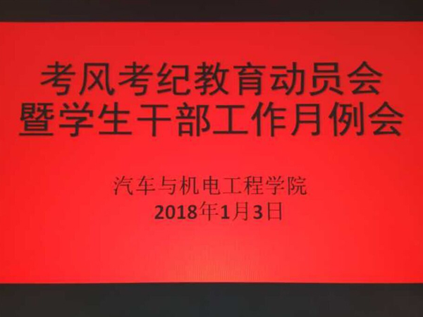 为加强考风建设,严肃考纪,1月3日,汽车与机电工程学院在志勤楼二楼会议室召开了考风考纪教育动员会暨学生干部工作月例会,该院党总支书记黄挺、副书记汪玉奎、团总支书记沈雪琪、学工秘书姚钢及学生干部代表参加本次会议。会议由黄挺主持。